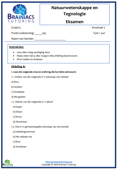 Hierdie eksamenvraestel vir Kwartaal 2 is volgens die 2024 ATP voorberei. Dit tel 45 punte en toets die leerders se vaardighede oor die volgende konsepte: