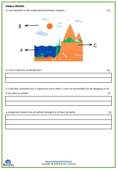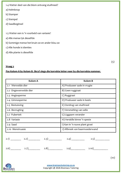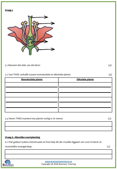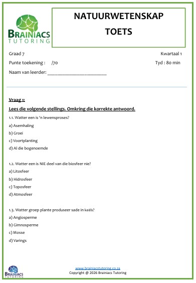 Hierdie toets vir Kwartaal 1 is volgens die 2024/25 ATP voorberei. Dit volg die kognitiewe vlakke soos uiteengesit in die KABV. Dit tel 70 punte en toets die leerders se kennis en vaardighede oor die volgende konsepte: