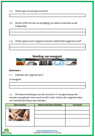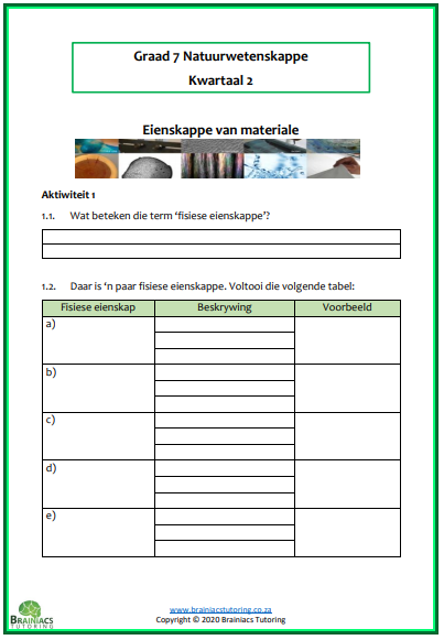 Hierdie werkkaarte bestaan uit 11 bladsye wat handel oor al die eenhede wat in kwartaal 1 behandel word. Dit is volgens die CAPS kurrikulum en gebaseer op die VIA-Afrika handboeke.