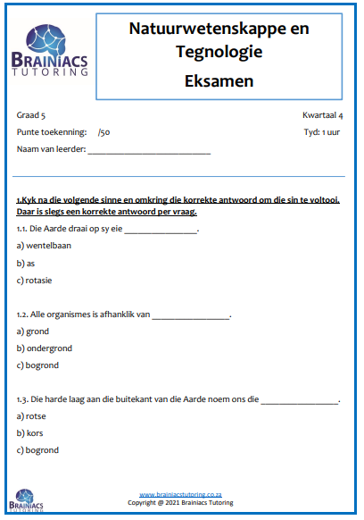Hierdie Kwartaal 4 toets / eksamen behandel die hele kwartaal se werk soos uiteengesit in die 2021 ATP’s. Die ATP’s sluit ook sekere konsepte in van Graad 4. Hierdie konsepte is ook in die toets ingesluit.