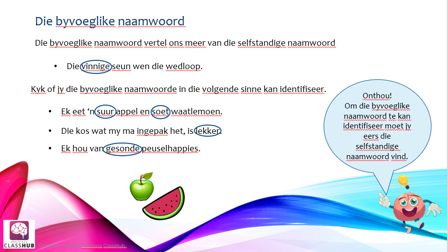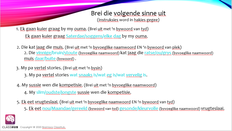 Hierdie PowerPoint behandel ook die byvoeglike naamwoord en bywoord as deel van sinsuitbreiding.