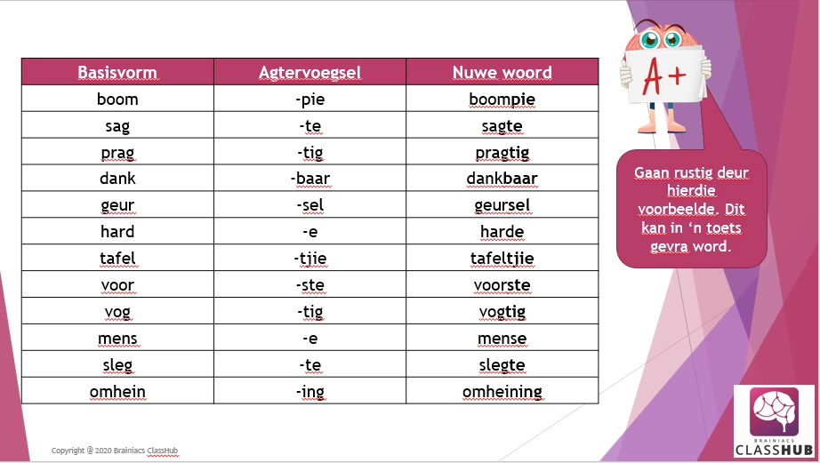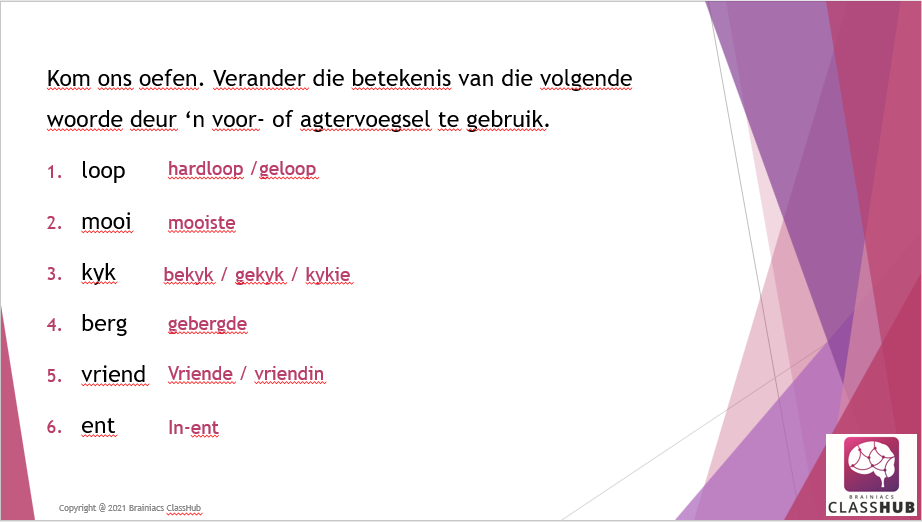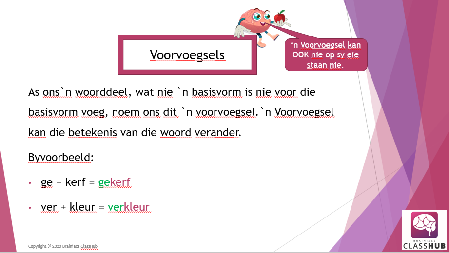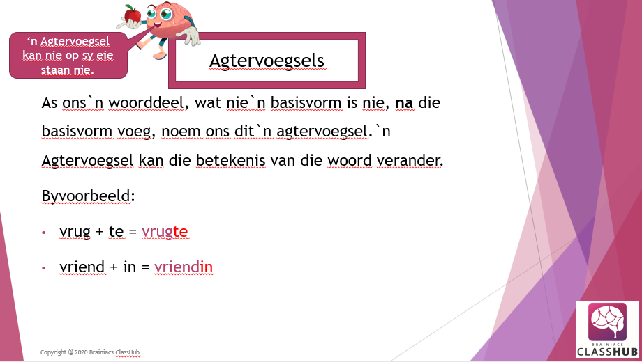Hierdie PowerPoint vertoning bespreek die konsep van voor- en agtervoegsels en die verskillende reëls wat moet toegepas word.