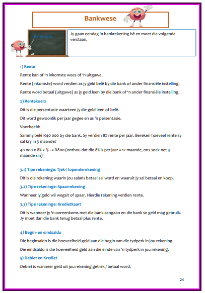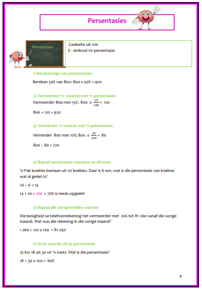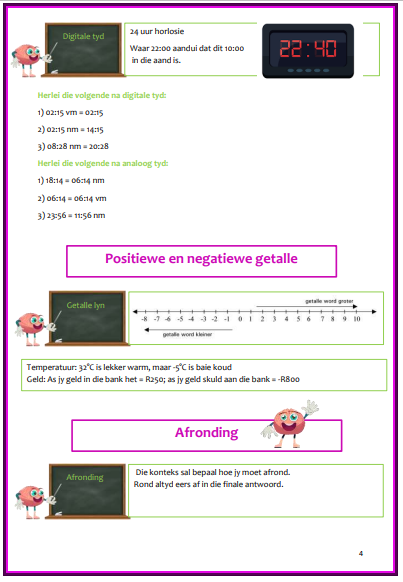 - Getalle: Getal formate, tyd, heelgetalle, afronding, verhoudings, koers, eweredigheid, persentasies,
