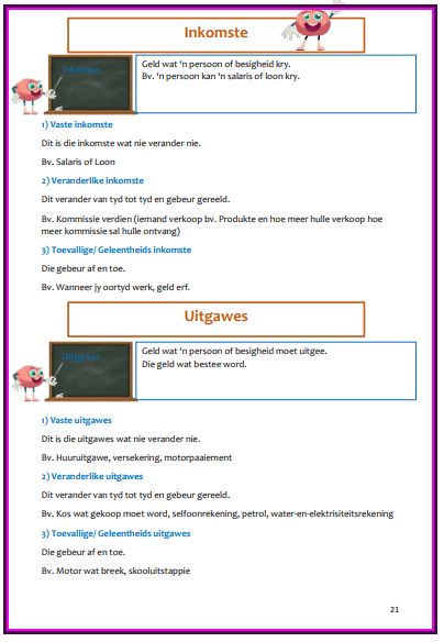 - Finansies: inkomste, uitgawes, wins/verlies, inskomse-en-uitgawe-staat, begrotings, bankwese,